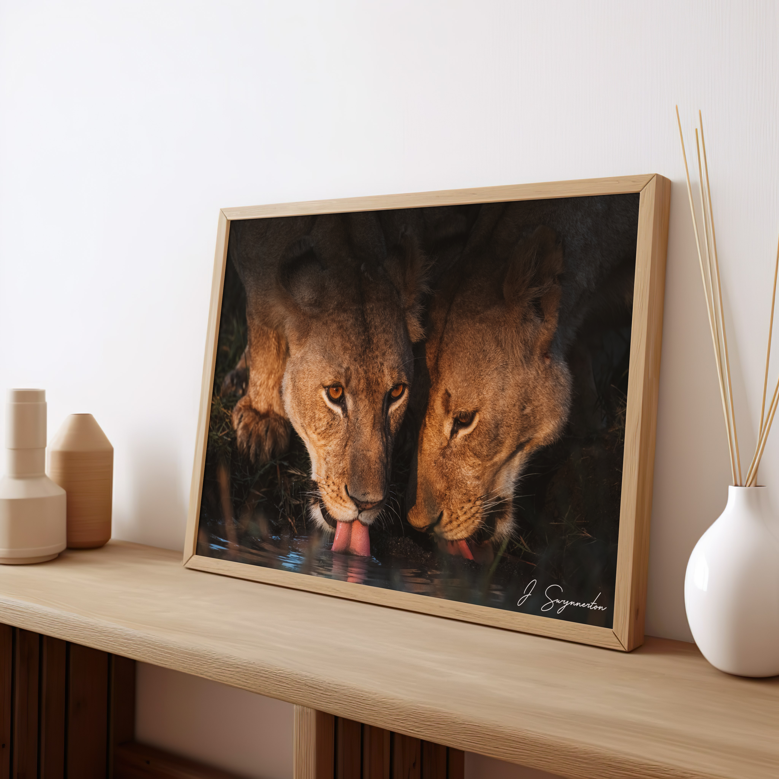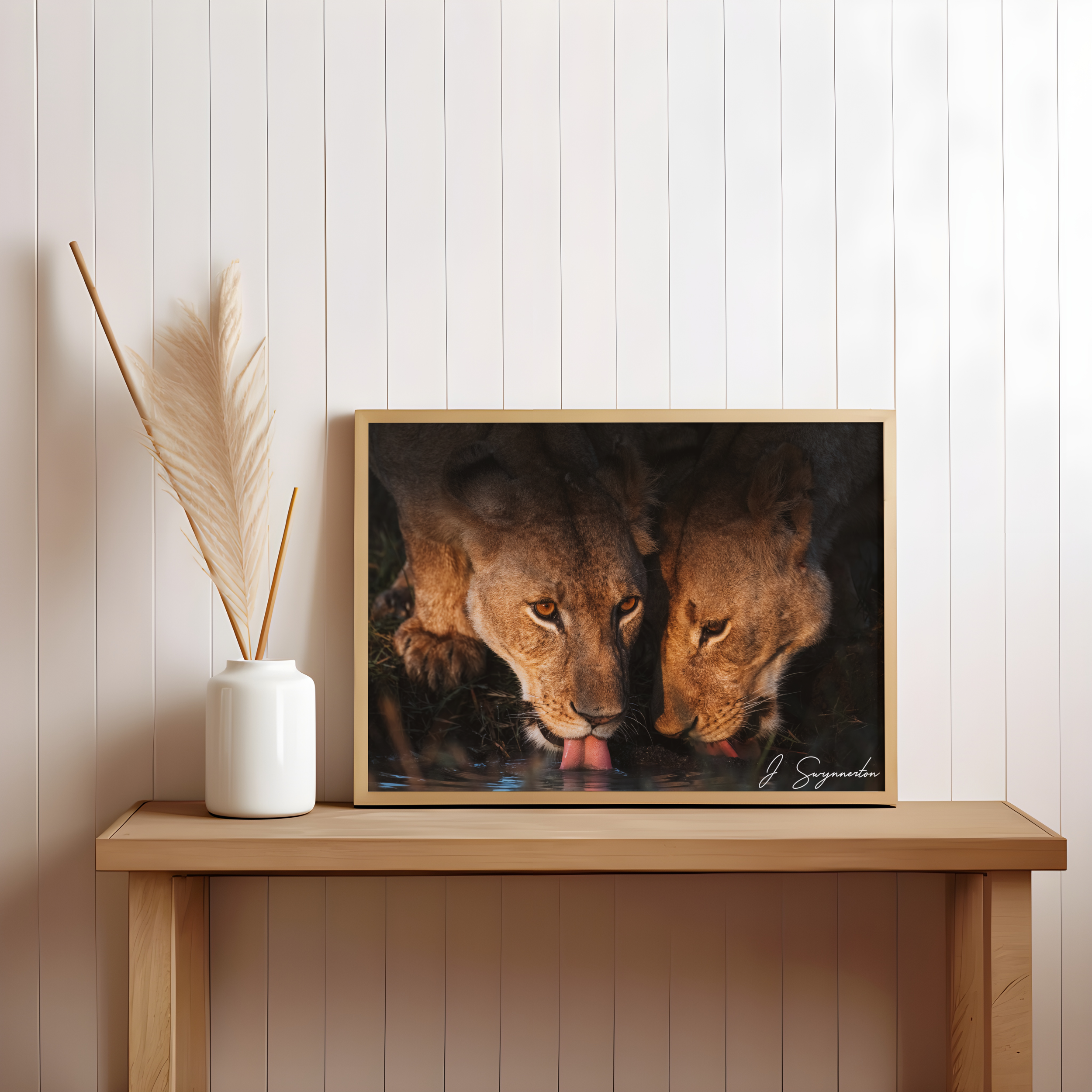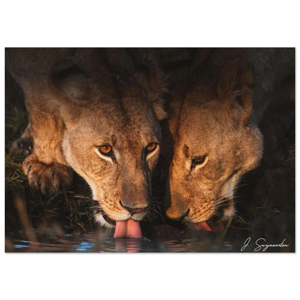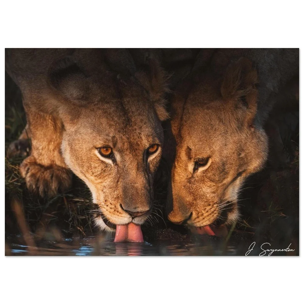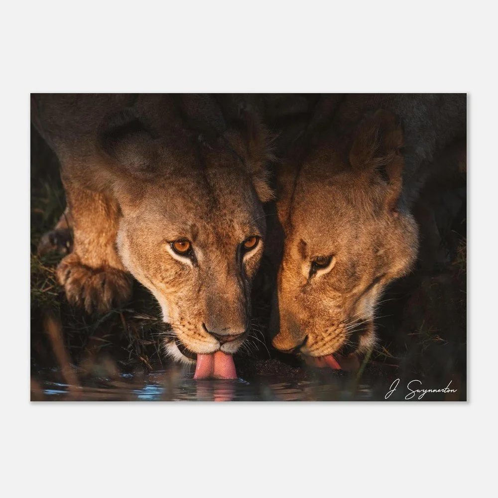 Printed on museum-quality matte paper, the deep shadows and warm highlights are rendered with stunning clarity. The velvety, non-reflective finish ensures that the soulful gaze of the lioness and the delicate ripples in the water remain the focal point, making it a sophisticated addition to any space.