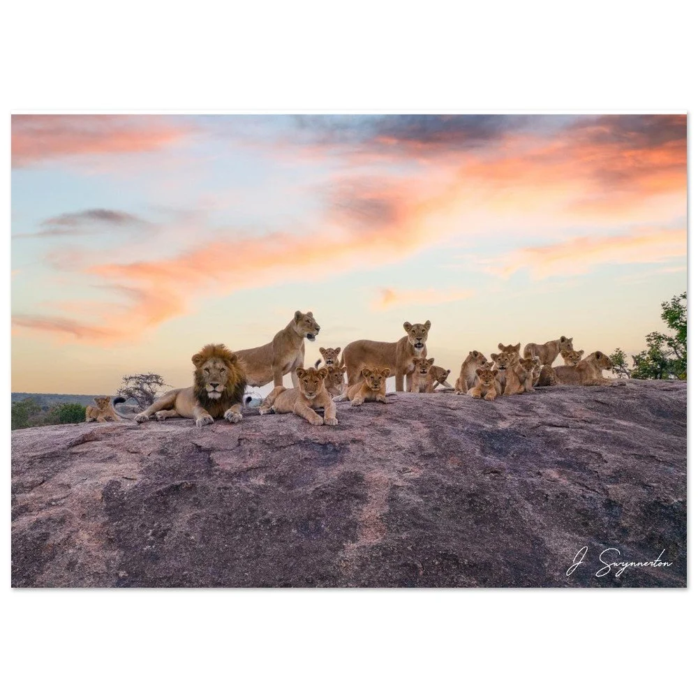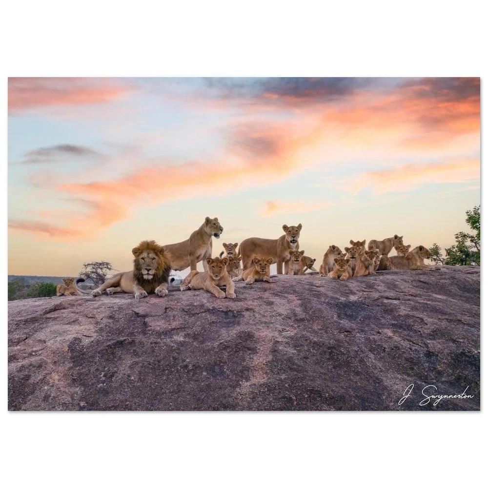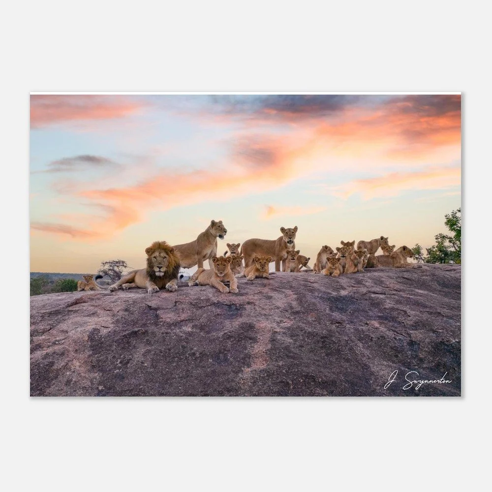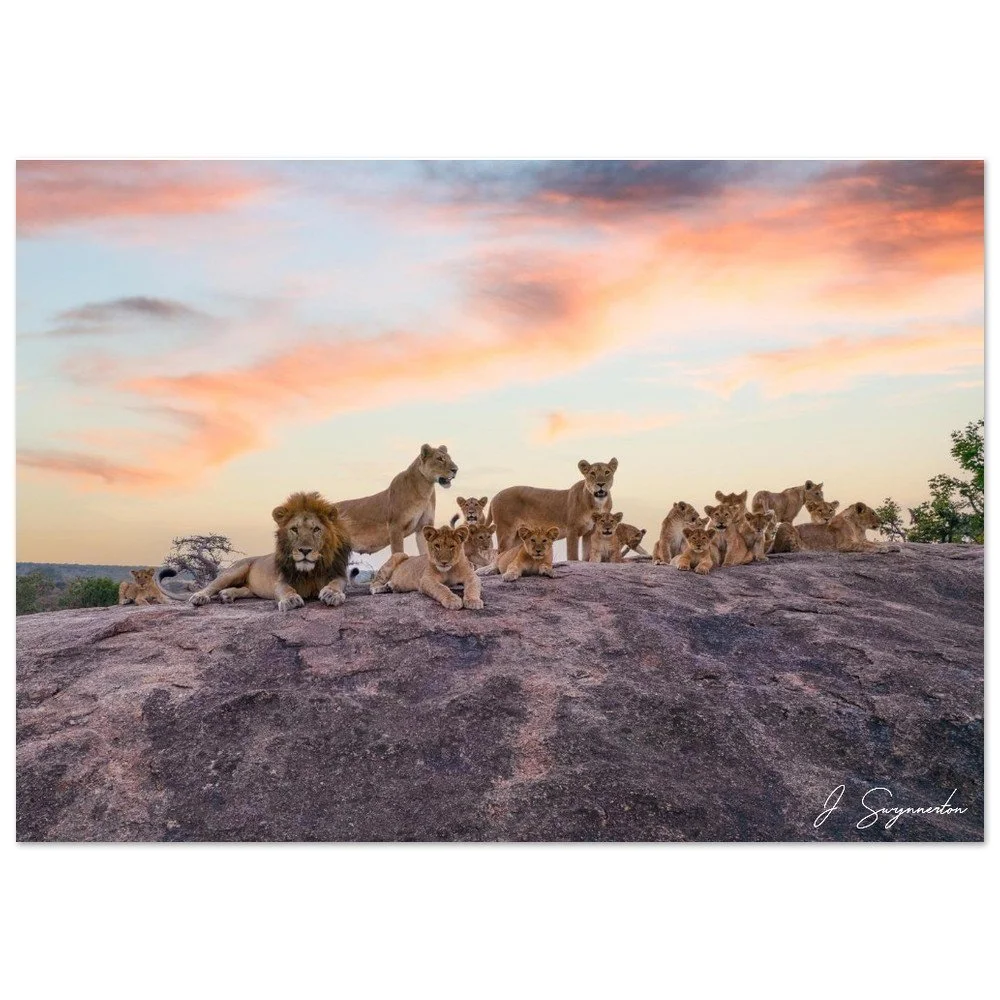 This breathtaking fine art photograph captures the sheer scale and social bond of a magnificent lion pride. Perched atop a rugged granite kopje, the pride—led by a regal male and several lionesses—watches over their playful cubs as the sky erupts in soft wisps of orange, pink, and violet. It is a rare and expansive look at the "King of the Jungle" in a moment of peaceful, familial connection.