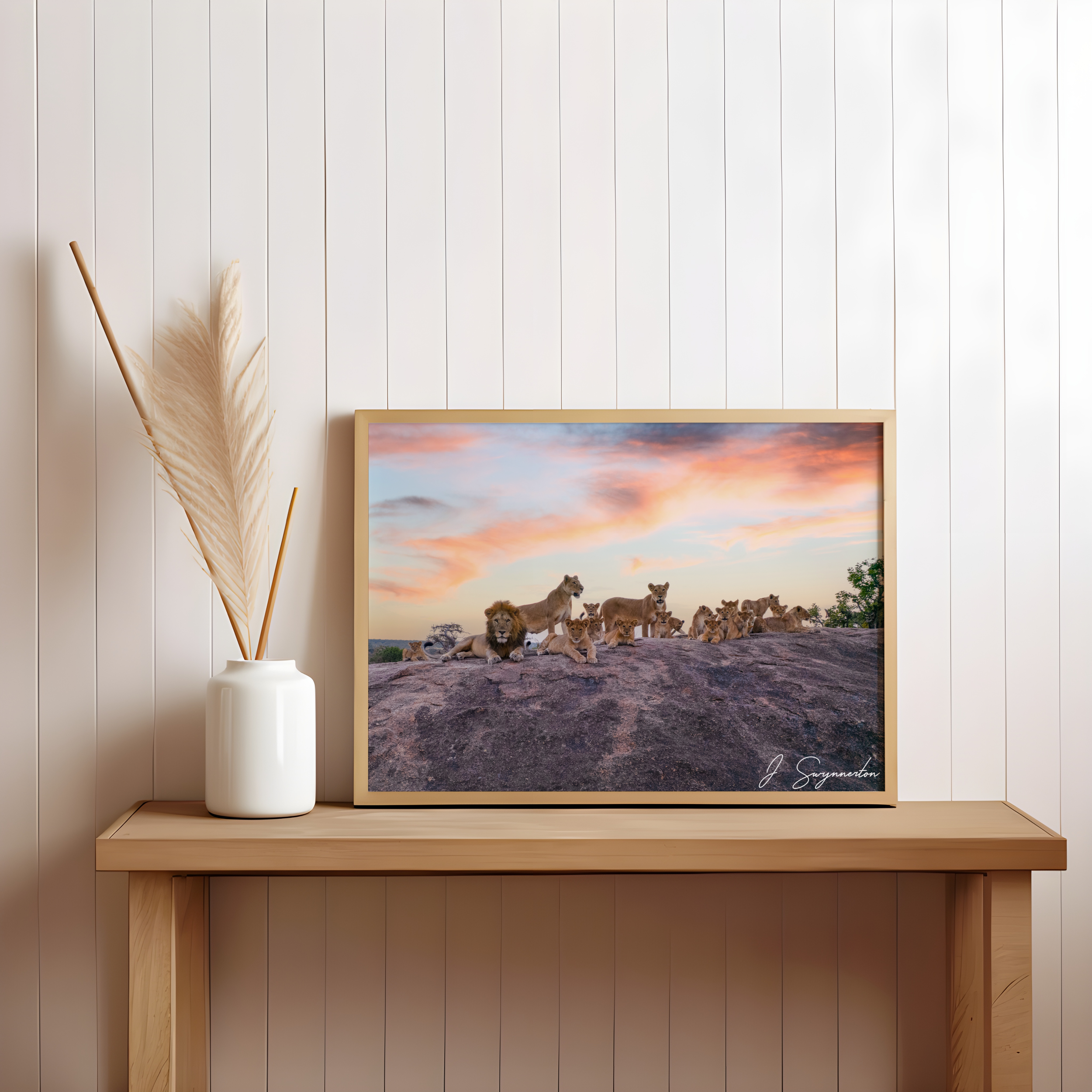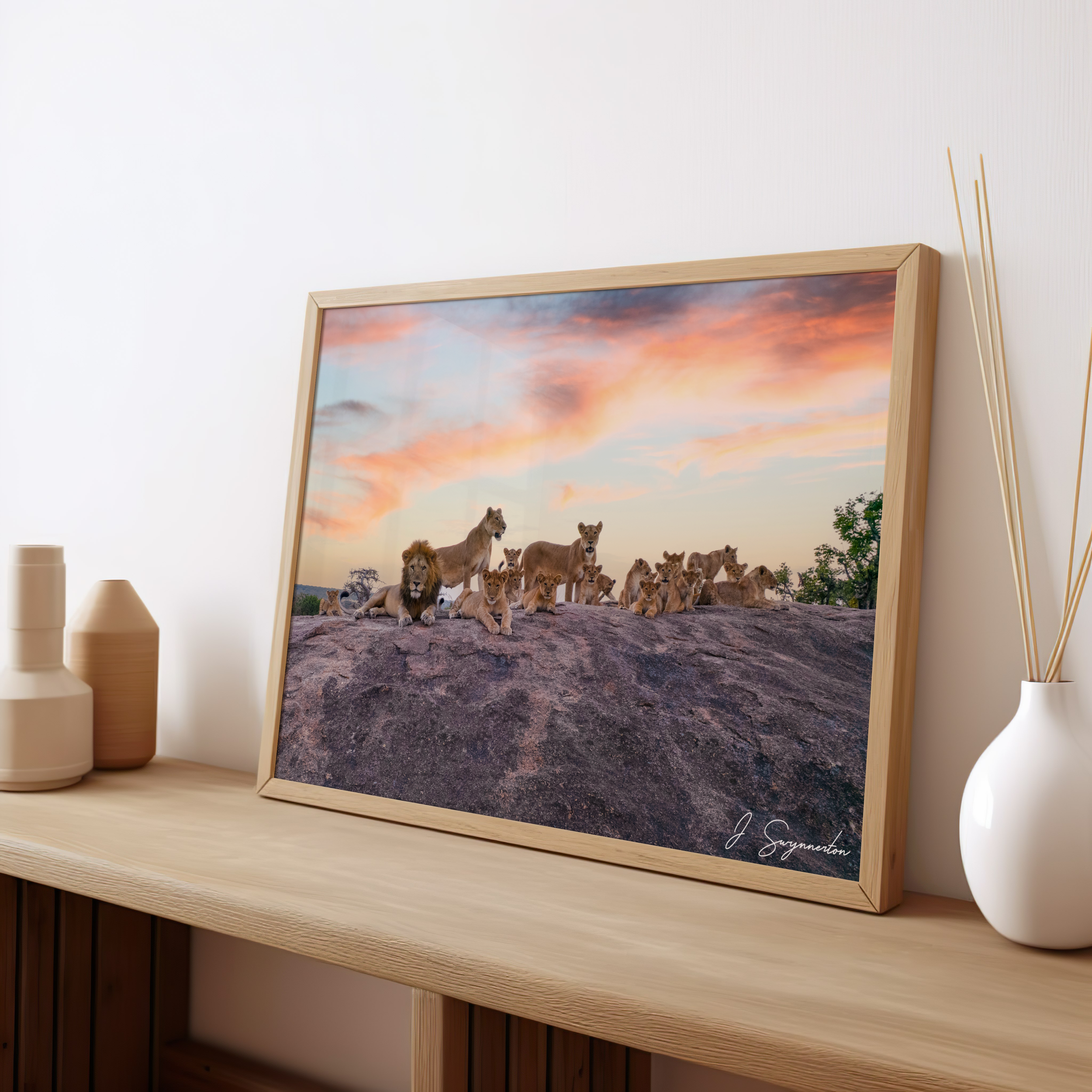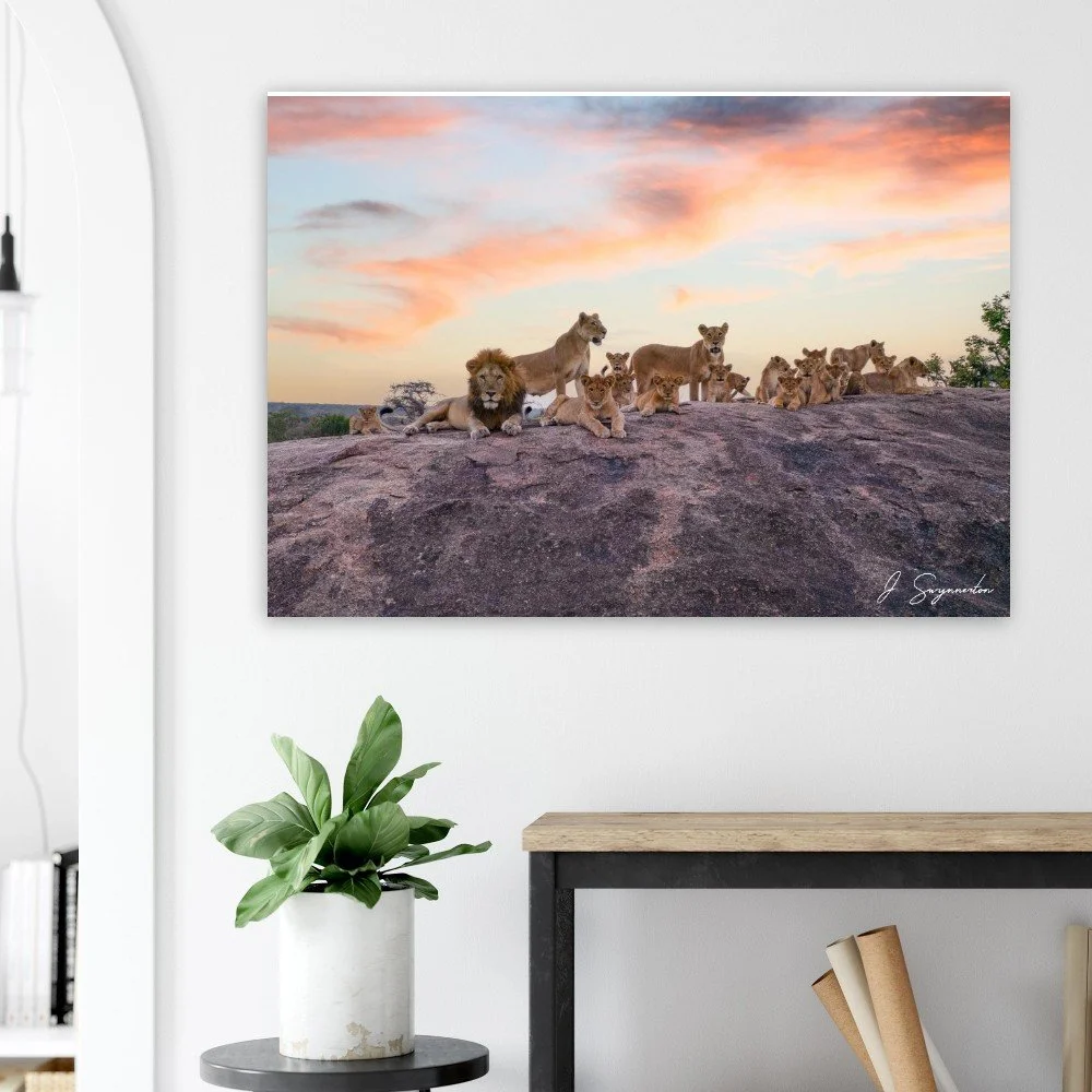 Printed on museum-quality matte paper, the expansive sky and textured rock are rendered with stunning clarity and depth. The non-reflective finish ensures that the subtle gradients of the sunset and the intricate details of the lions' manes are visible from every angle, making it an ideal centerpiece for a large living space or a professional gallery wall.