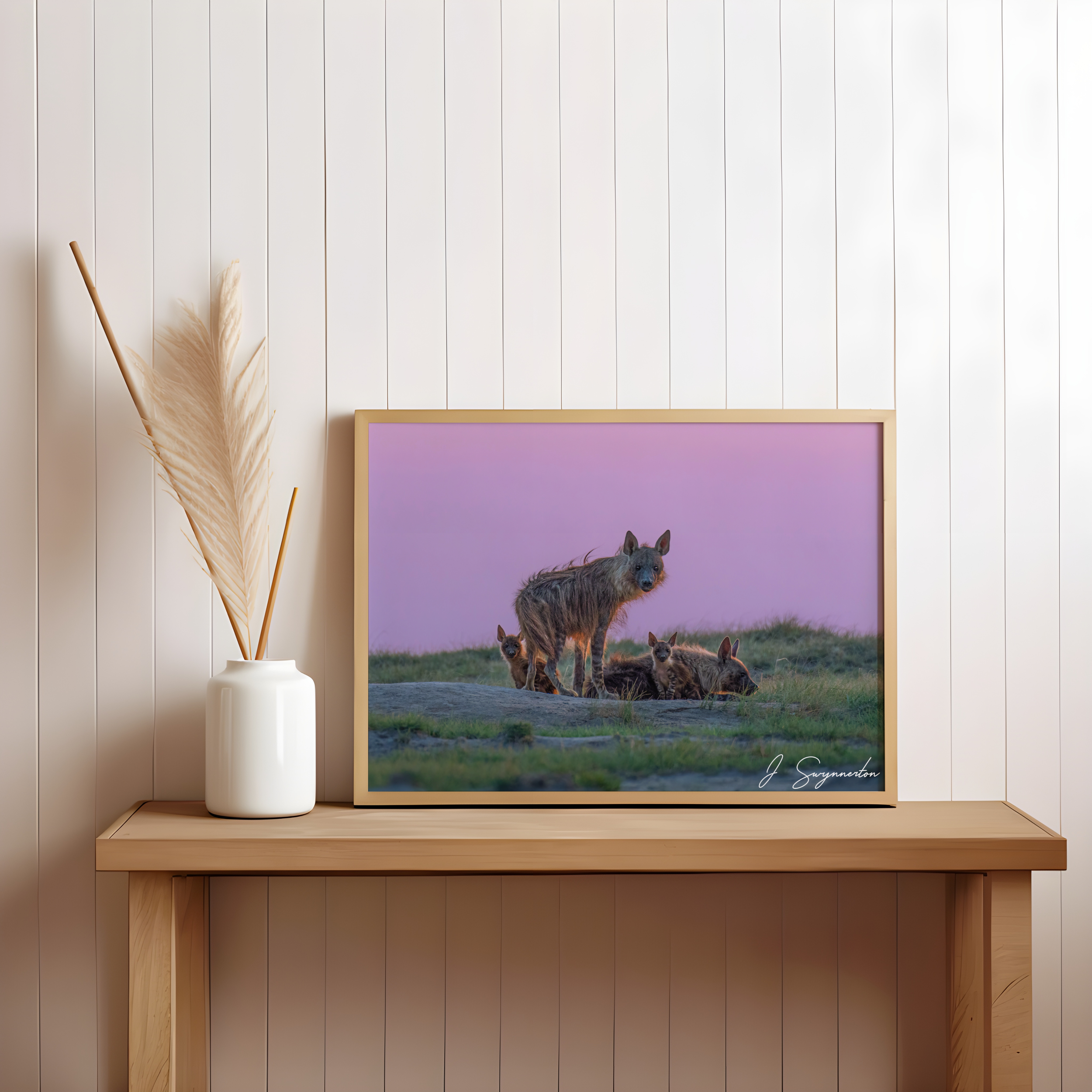 Printed on museum-quality matte paper, the velvety texture of the print enhances the soft gradient of the sunset while preserving the sharp, soulful detail in the eyes of the cubs and their protector. It is a piece that balances wild intensity with a peaceful, calming palette.
