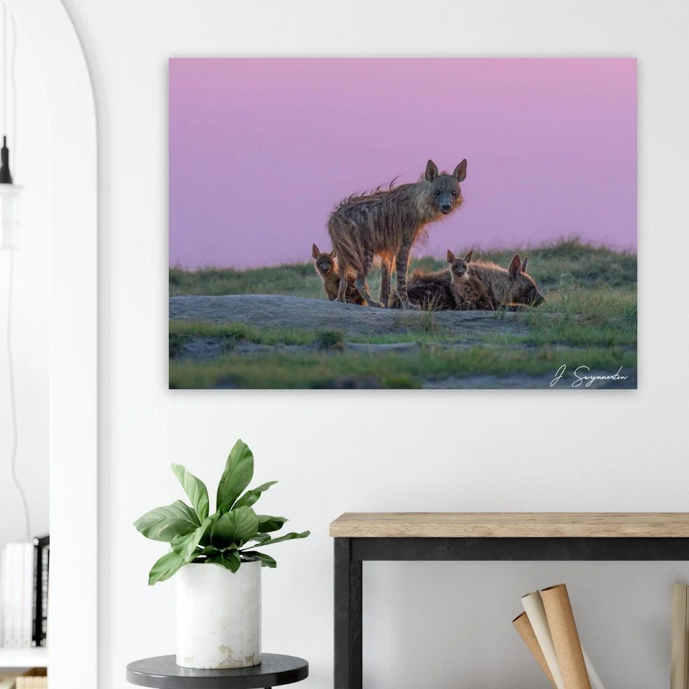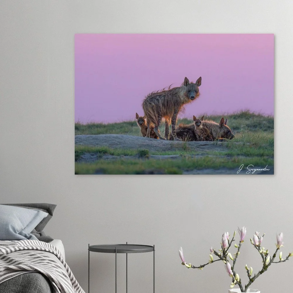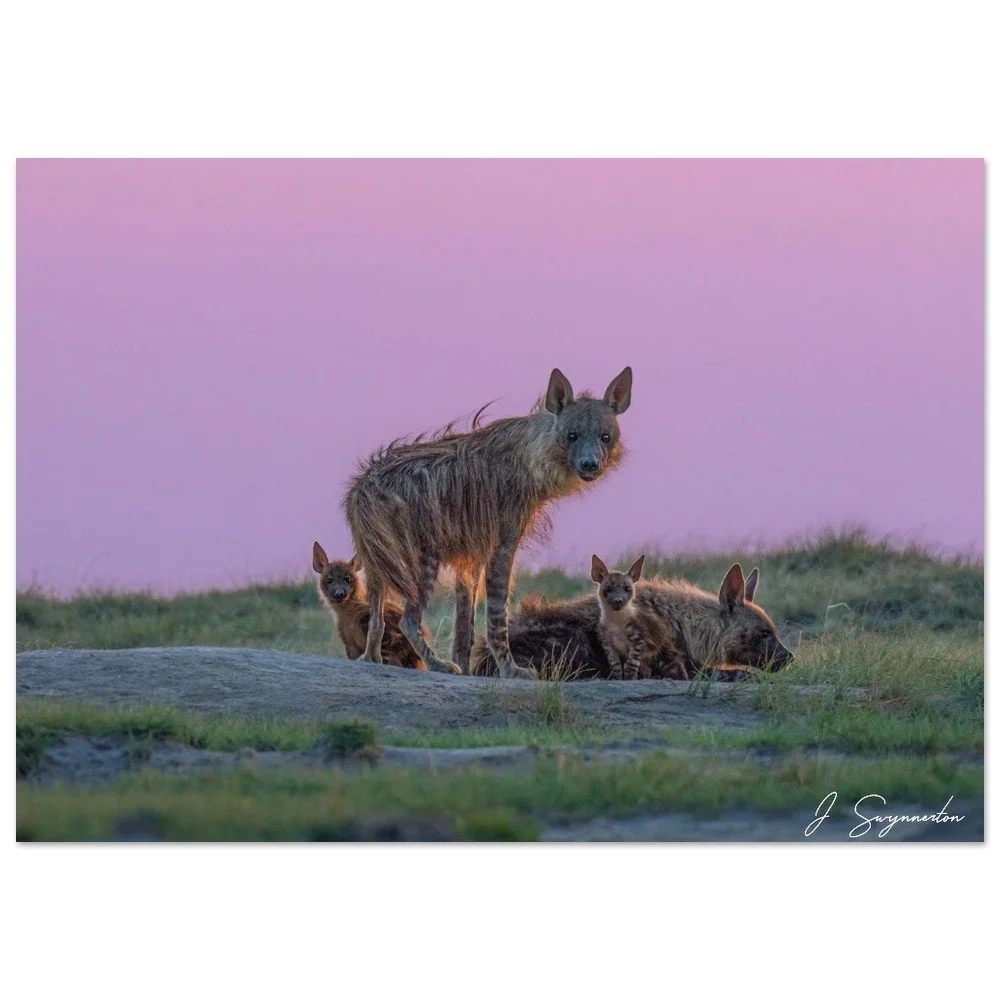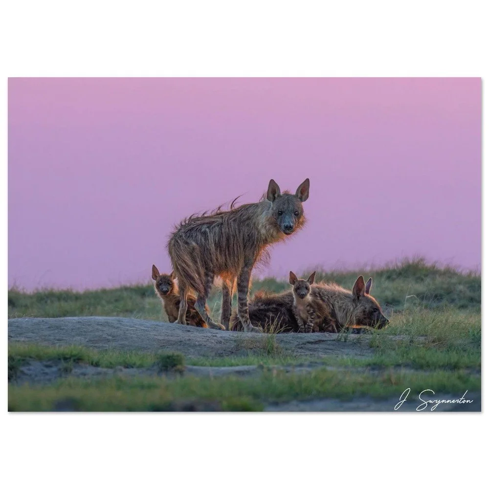This breathtaking fine art photograph captures a rare moment of connection: a Brown Hyena family gathered at dusk against a vibrant, pastel-hued sky. The golden "rim lighting" on their shaggy coats contrasts beautifully with the soft violets and pinks of the horizon, showcasing these misunderstood creatures in an unexpectedly tender and majestic light.